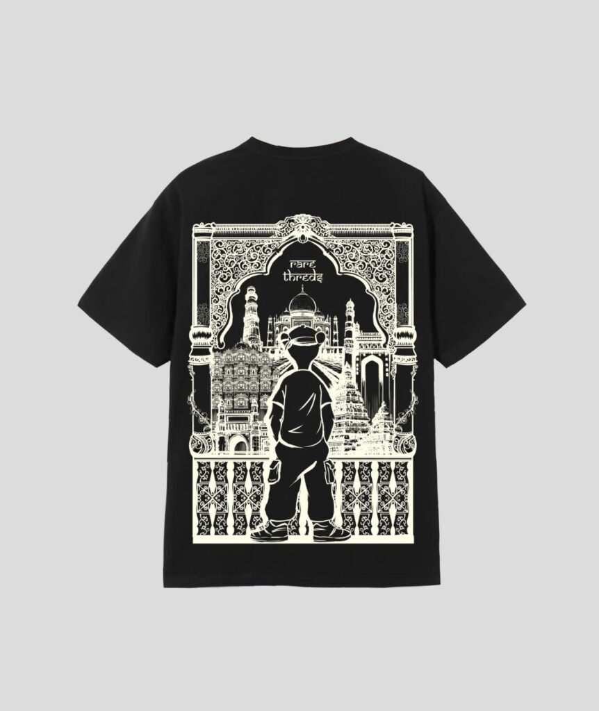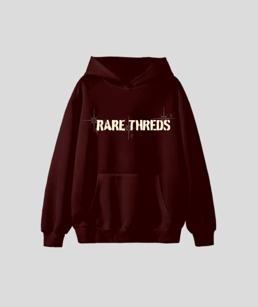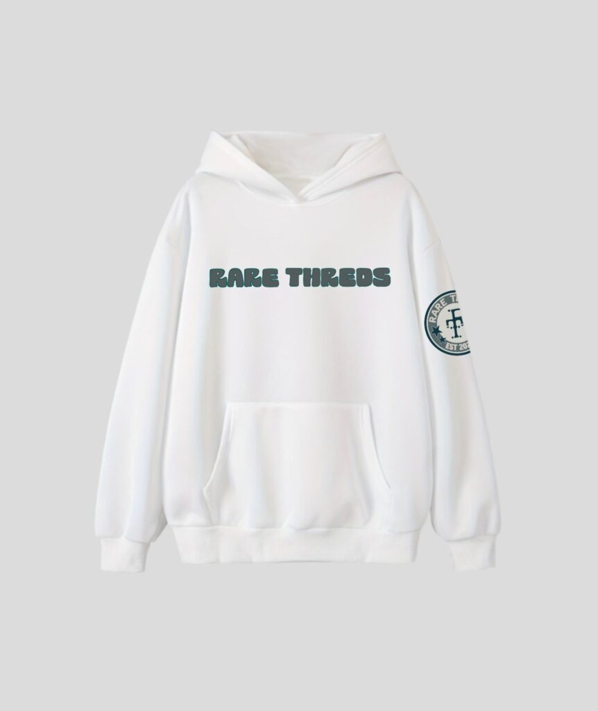 Design Elements: Front: Embroidered “RARE THREADS” logo with floral detailing, Back: Elegant floral embroidery with a bold artistic flair