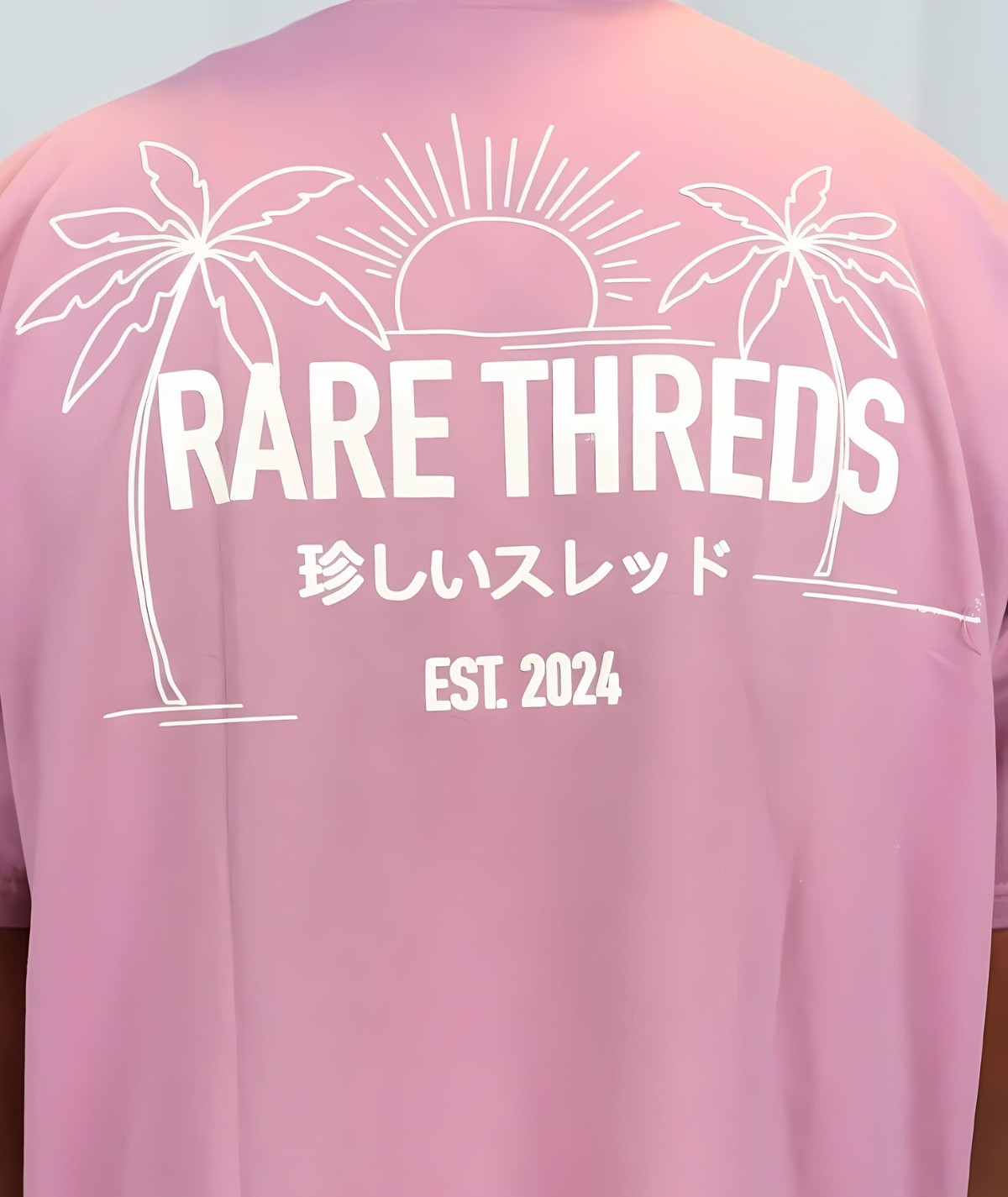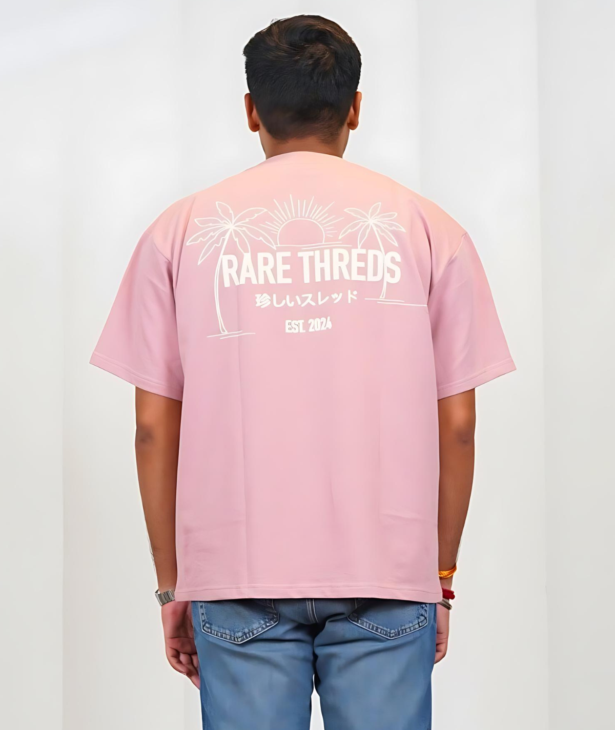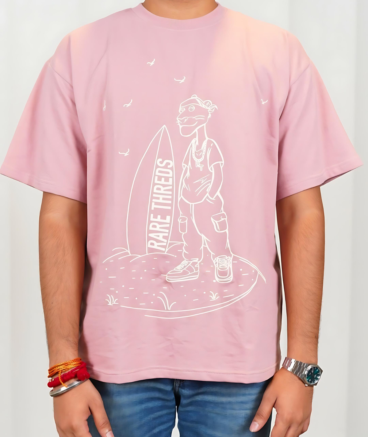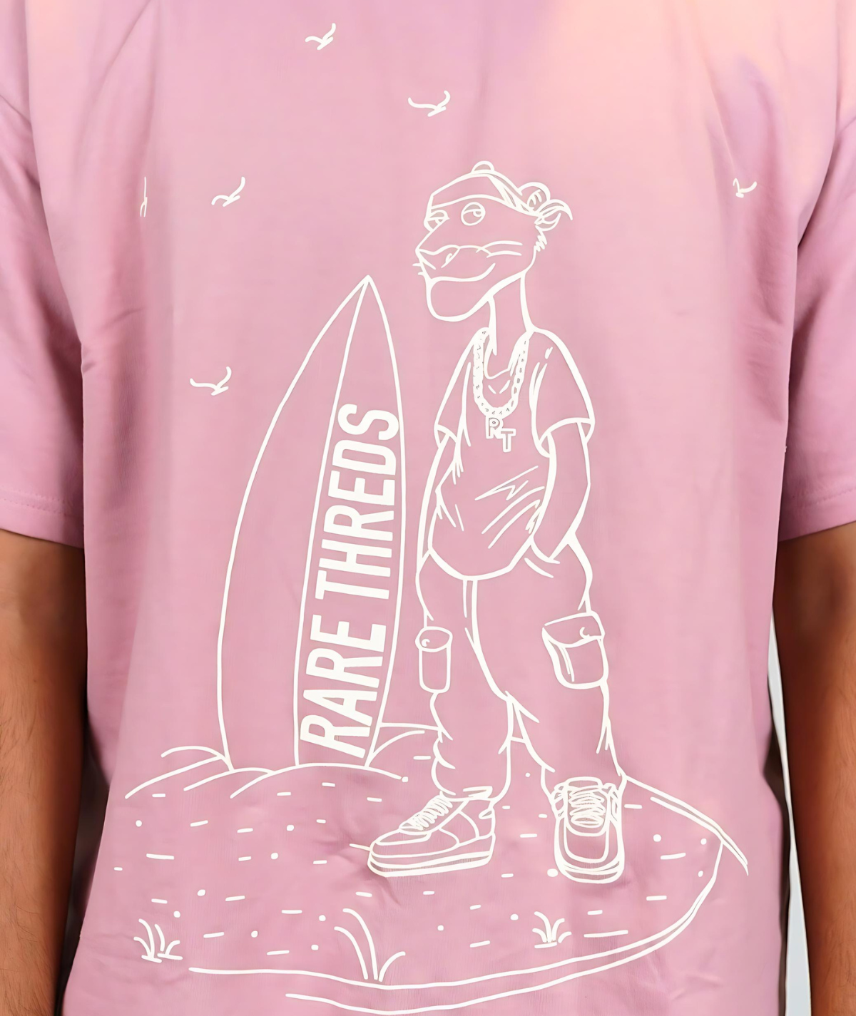 This pink oversized T-shirt perfectly combines a fresh aesthetic with superior comfort. The round neck and oversized fit make it a versatile piece for casual wear, while the character graphic and brand name “RARE THREADS” create a bold visual statement. The character, standing confidently beside a surfboard, reflects a laid-back yet confident vibe, perfect for streetwear lovers.